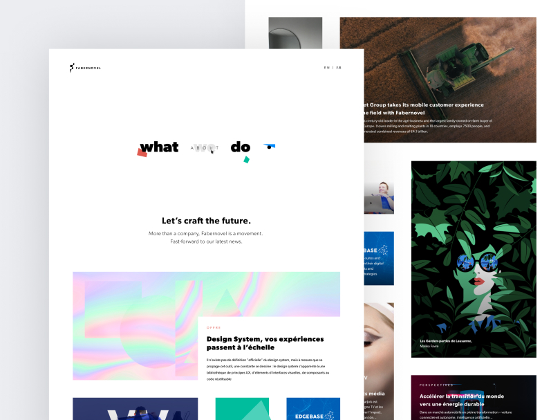 Travail avec Benoît Talabot, directeur créatif de Fabernovel. Principe de la charte : logo, typo, couleurs et polygons. Décliner pour créer un vocabulaire visuel à la marque Fabernovel.