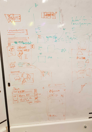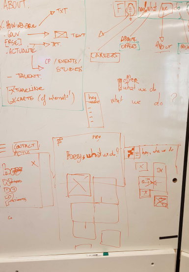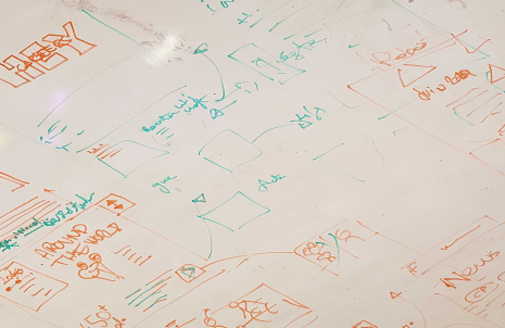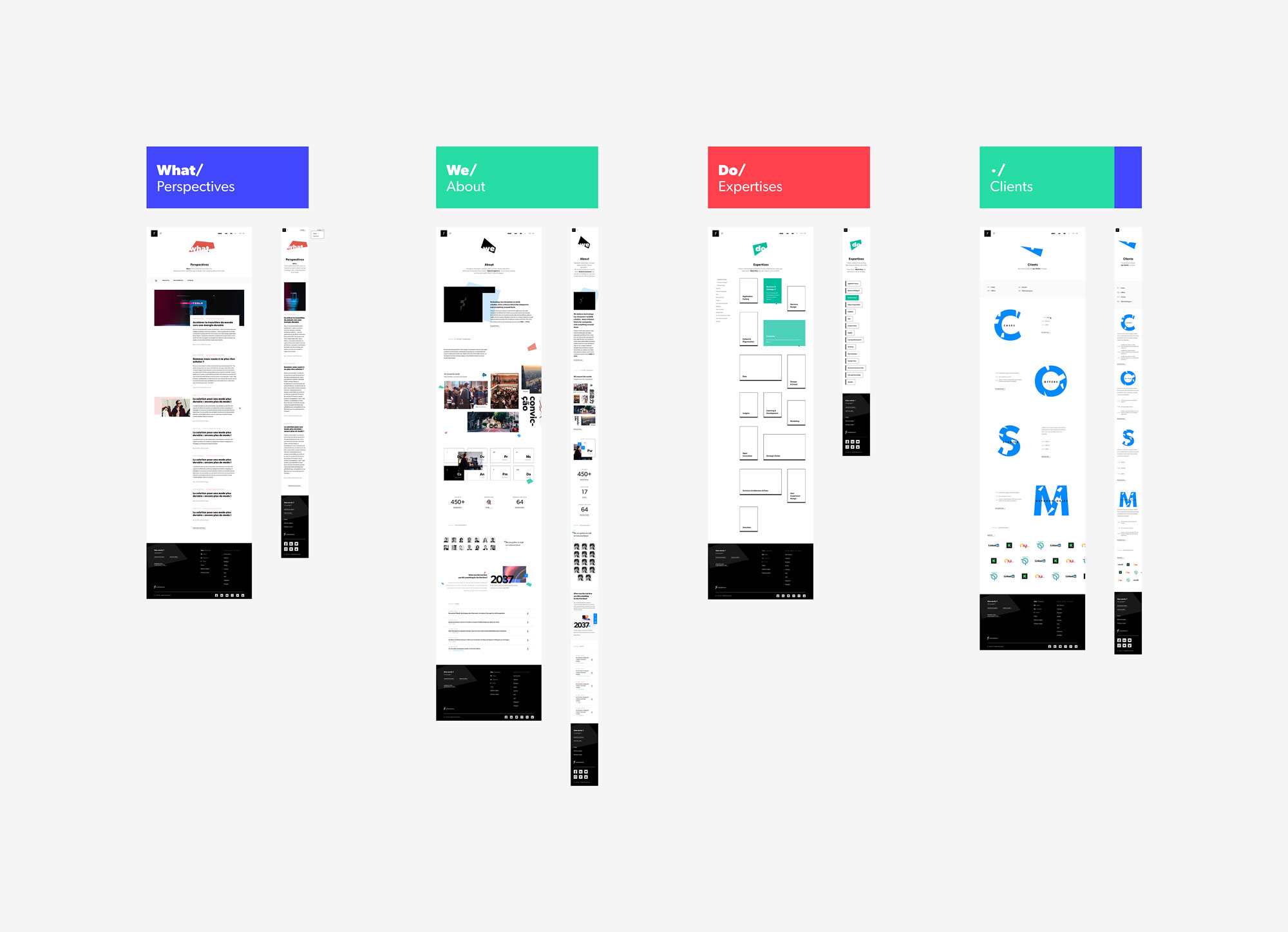 --> Organisation des maquettes en les classant par type d'écrans suivant l'arborescence (petit site), puis ajoutant un code couleur traduisant son état (bleu : WIP ; vert : validé ; rouge : retours à apporter)